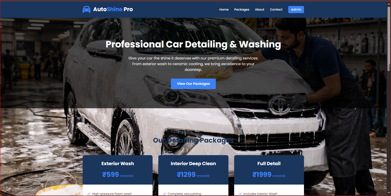 Premium car wash and detailing service website with booking flow, service showcase, and modern UI design.